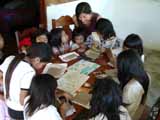 Heather Eiden with Lacandon children doing arts and crafts, Mensabäk, Mexico